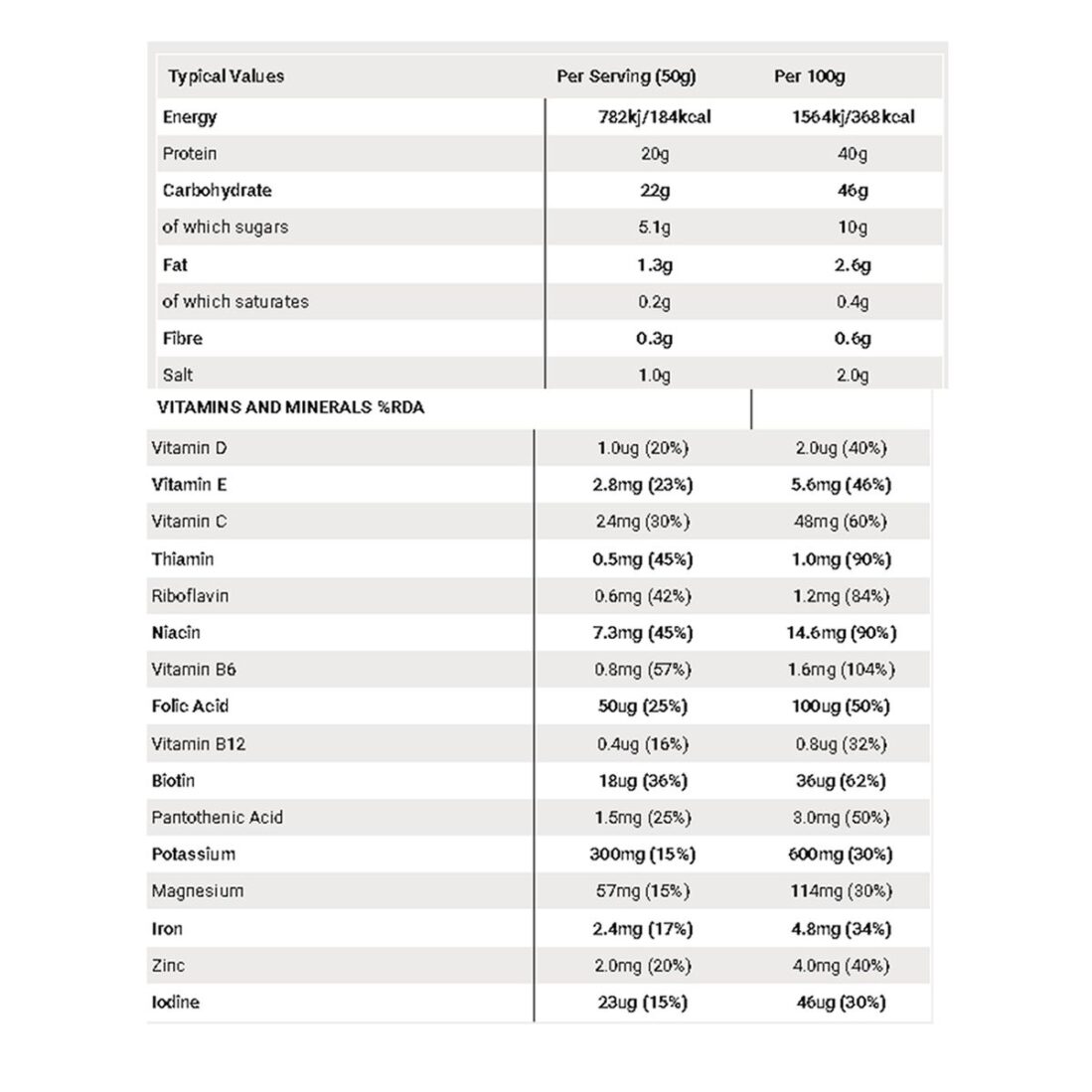Mezcla de carbohidratos (46%) (maltodextrina (de maíz), fructosa), proteína (46%) (aislado de proteína de soja), electrolitos (3%) (cloruro de sodio, cloruro de potasio, lactato de calcio, óxido de magnesio), aromatizadores naturales, l -Leucina, emulsionante (lecitina de soja), espesante (goma Xanthan), color (remolacha roja), vitaminas y minerales (ácido ascórbico, nicotinamida, acetato de alfa tocoferil , Citrato de calcio, ácido fólico, yoduro de potasio, biotina, vitamina D3, cianocobalamina), edulcorante (sucralosa)